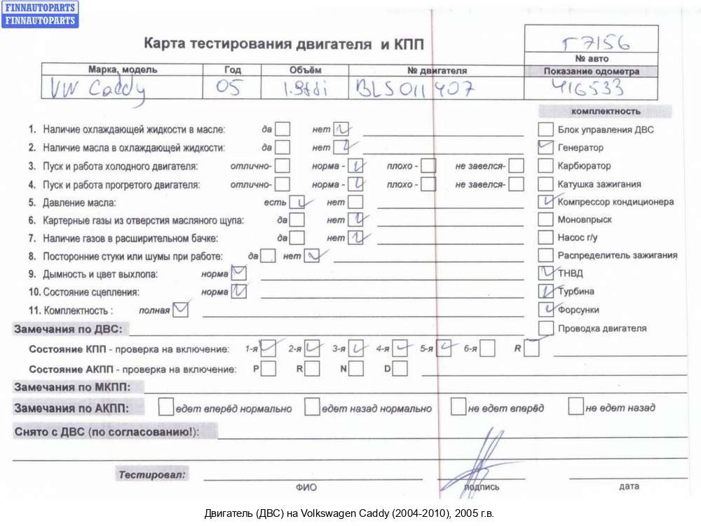 2009; Дизель; 2.0; BST, SDI; Фургон; ; белый; 2009, 2л, Дизель, SDI, BST, BST095067, 03G100033M, Фургон, белый, BST095067 | - | Г | С | Н, прокручивается, состояние ГРМ - нормально, поддон - нормально, клапанная крышка - нормально, эмульсия - нет,1 массовый. сломан щуп трещина клапанной крышки, трещина поддона (пробит),, трещина поддона (пробит)